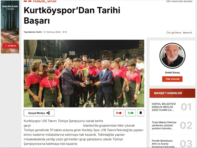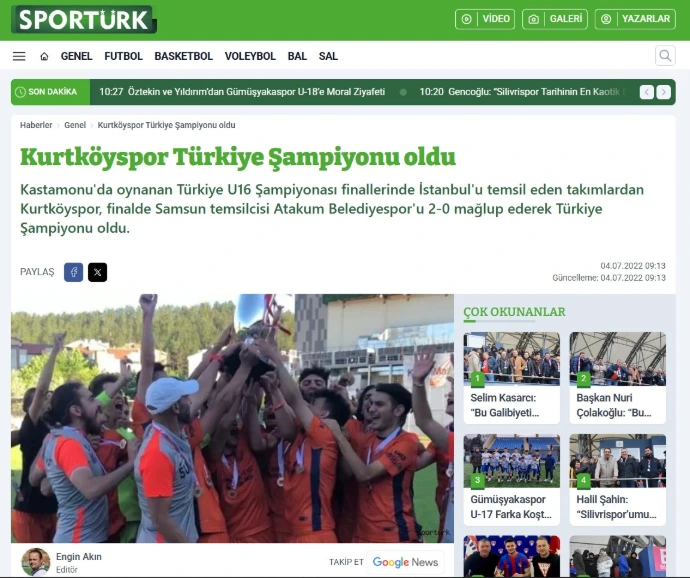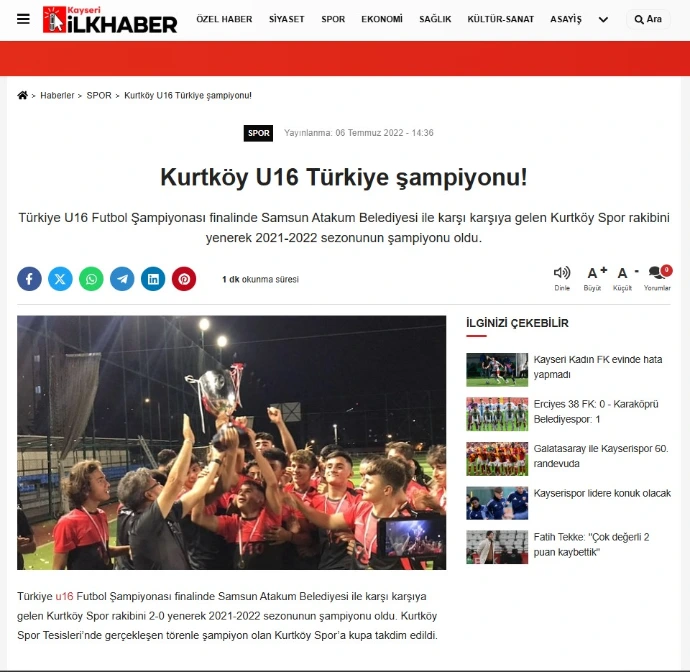 2021-2022 sezonu U16 Türkiye Şampiyonası final müsabakasında Samsun Atakumspor'a 2-0 üstünlük sağlayan İstanbul Kurtköyspor, Türkiye birincisi oldu.